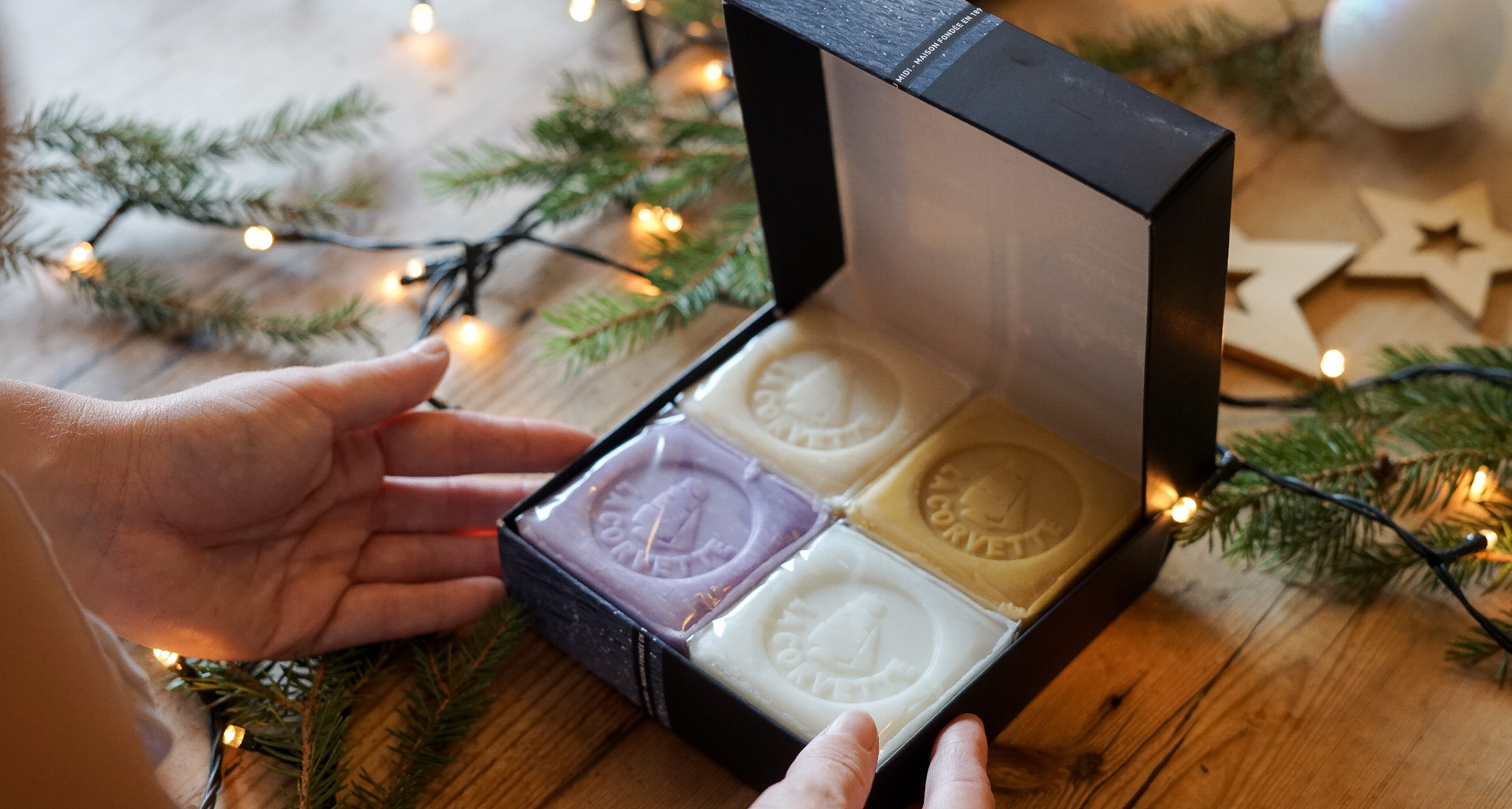 嚴選4款經典馬賽香氛皂,100%植物來源,不含防腐劑與動物性成分,溫和潔膚,適合全膚質。精美紙盒包裝,送禮首選,質感滿分。